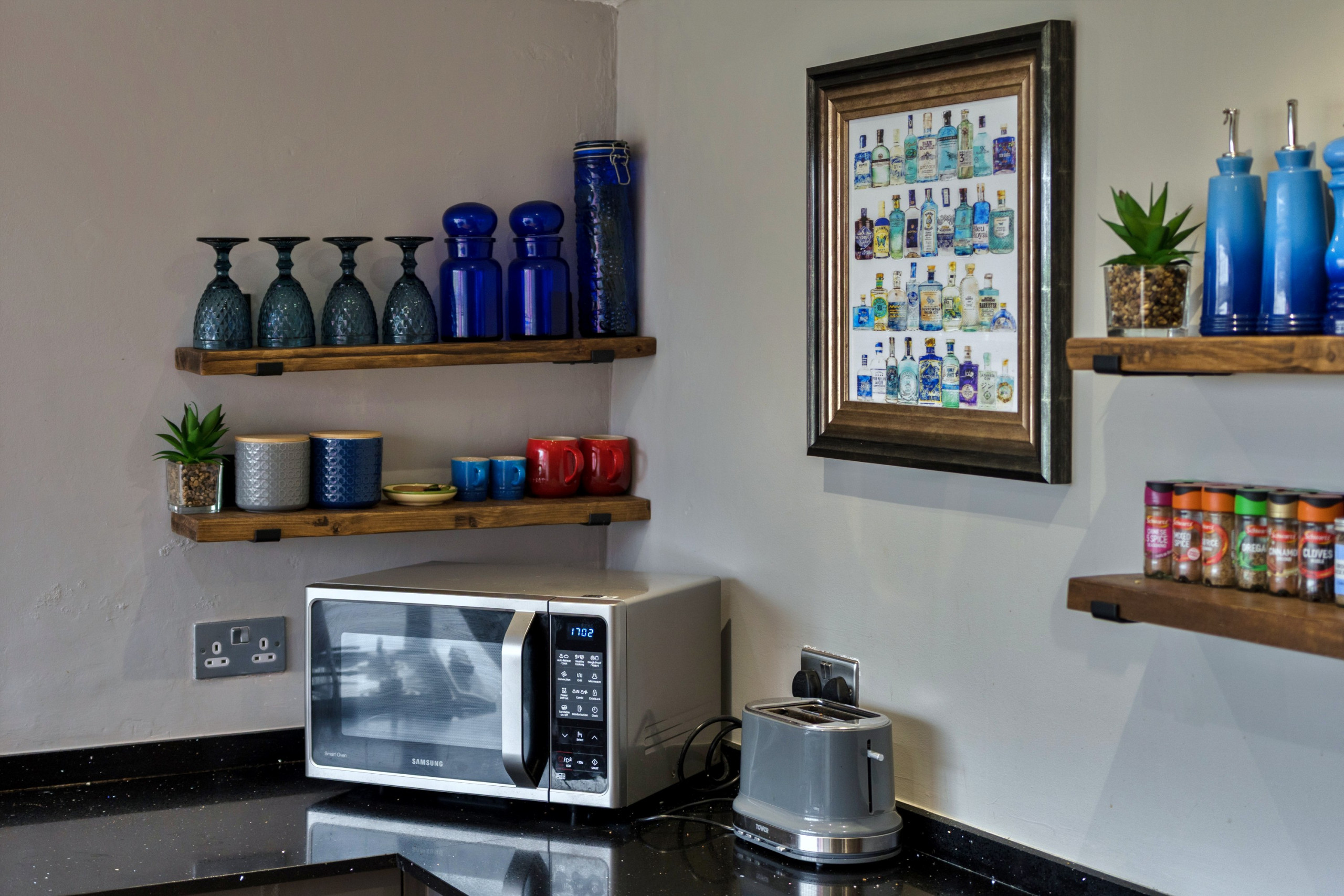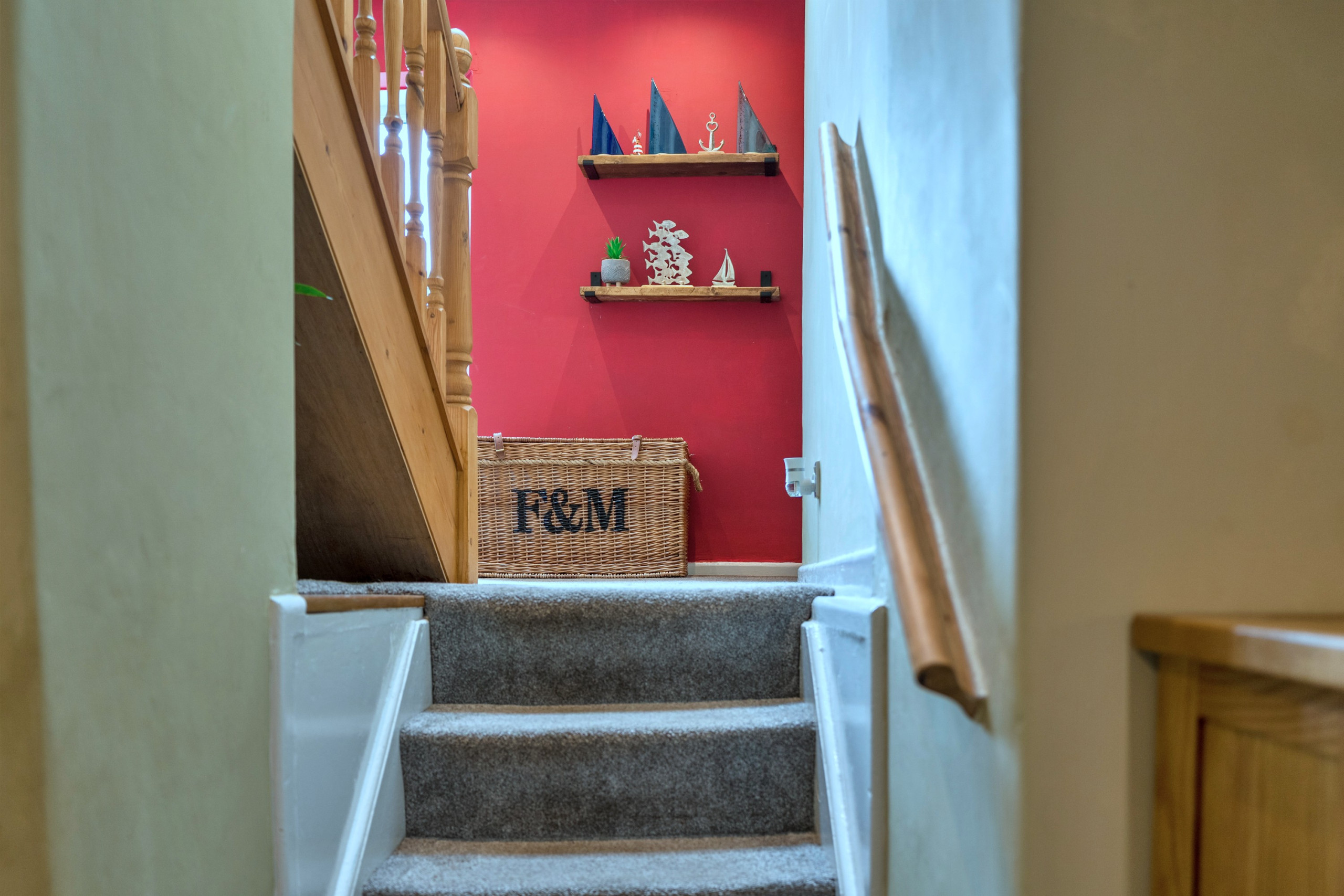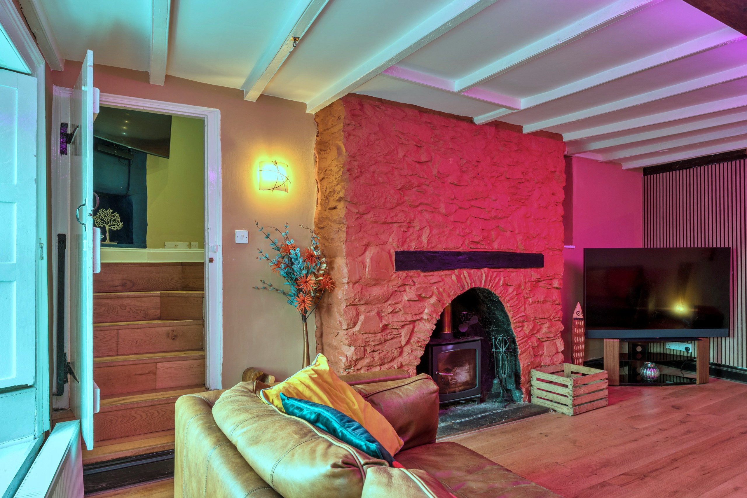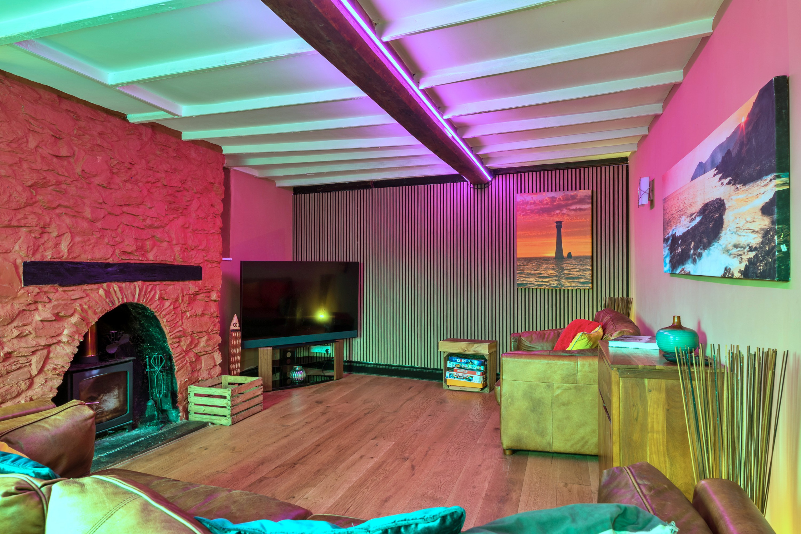 The open-plan kitchen and dining area is fully equipped and ideal for shared meals or lazy breakfasts. A few steps down, the sunken living room offers comfortable sofas, a log burner, TV, and a great selection of board games.