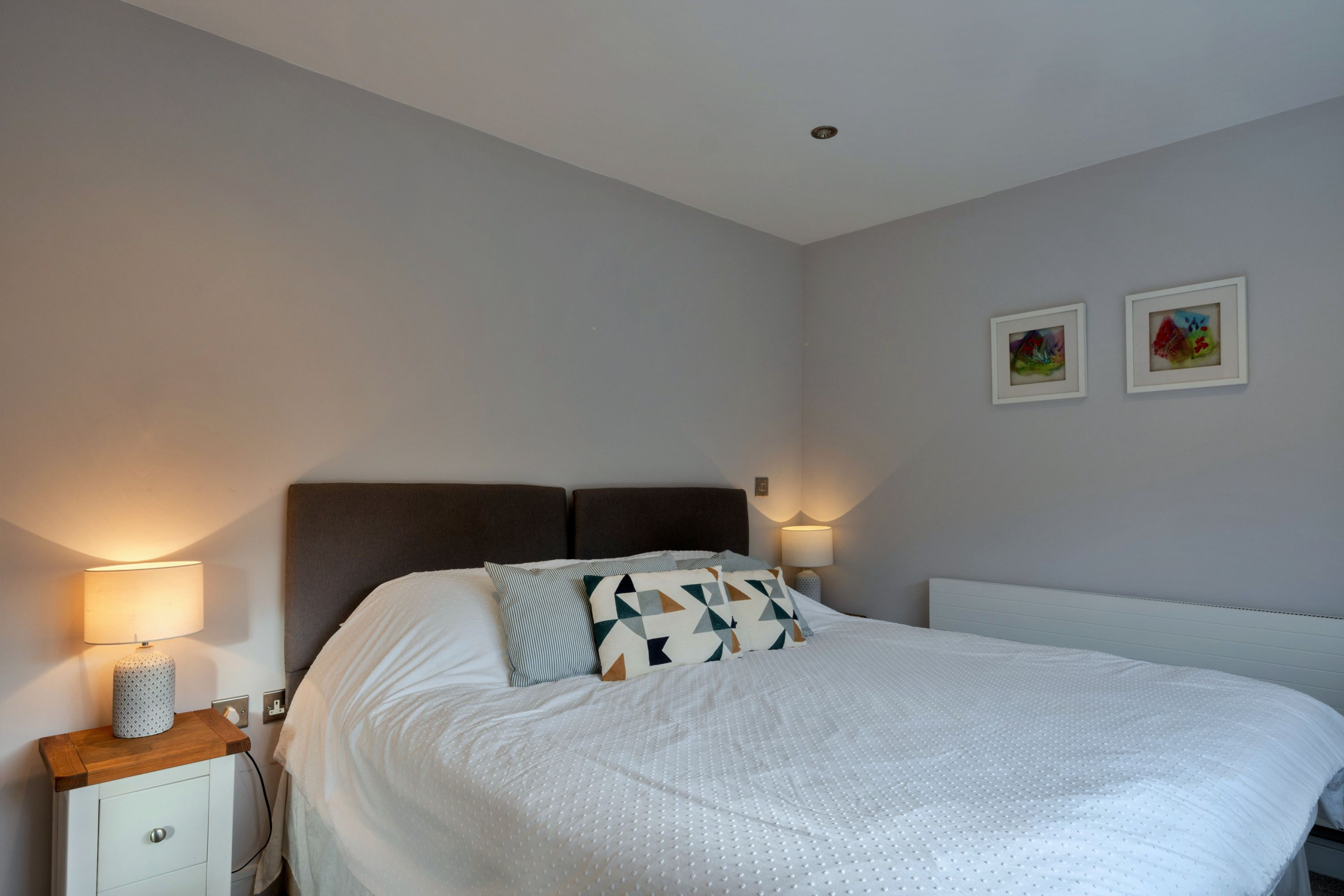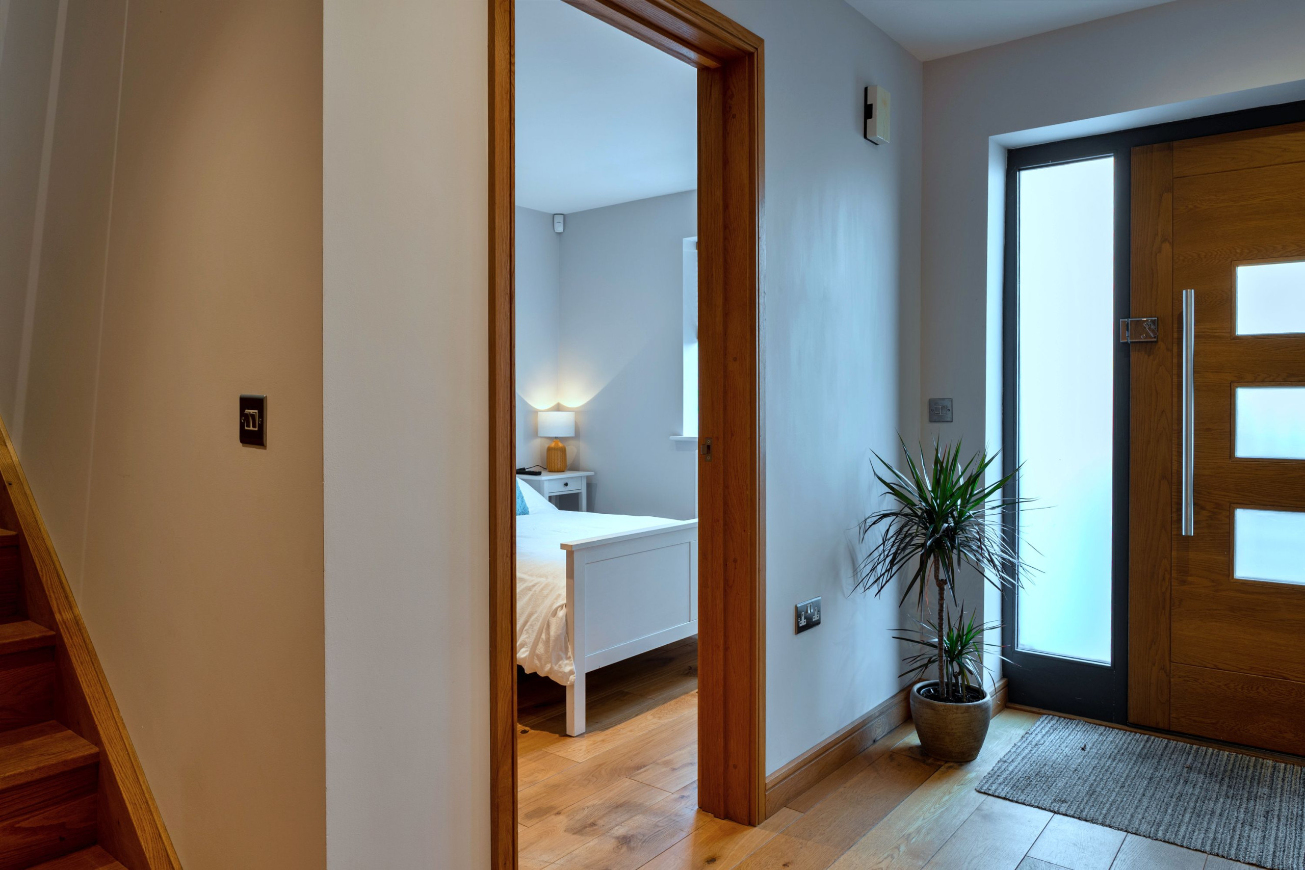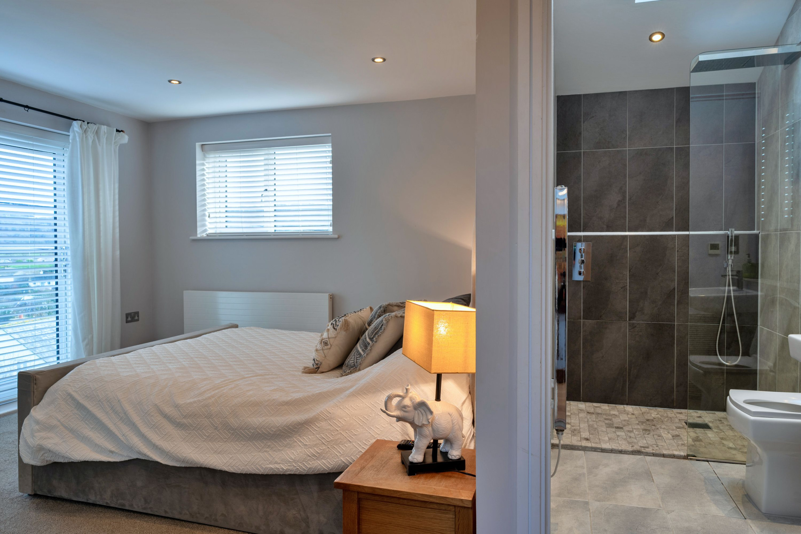 The sleeping layout works especially well for families travelling together. On the second floor there are three bedrooms: a king-size master with TV, en-suite shower room and Juliet balcony, a super-king that can be set up as twins on request, and a third twin room that can convert to a king-size if needed. A spacious family bathroom on this floor includes both a bath and a large walk-in shower. The fourth bedroom is a ground-floor double, making it ideal for grandparents or anyone who’d prefer fewer stairs.