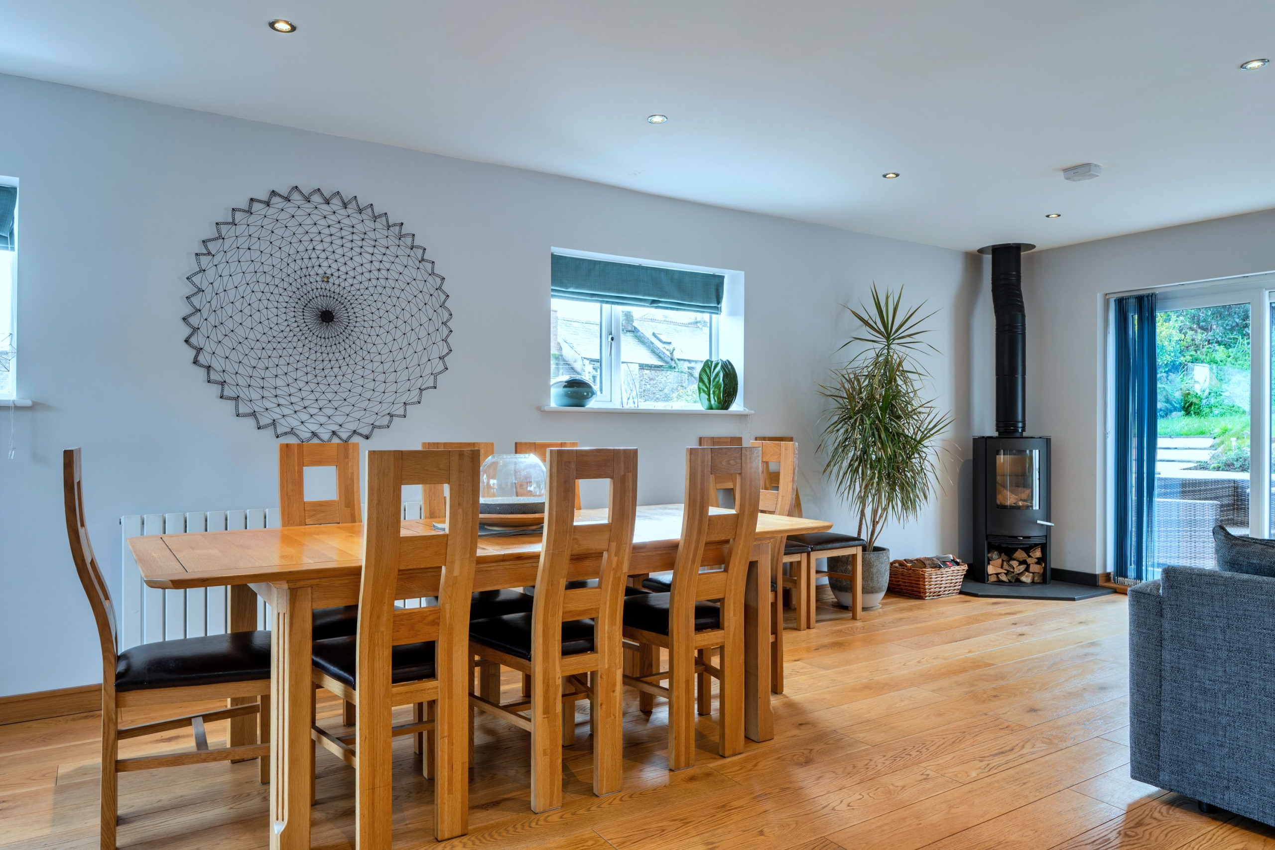 The open-plan kitchen and dining area is fully equipped and ideal for shared meals or lazy breakfasts. A few steps down, the sunken living room offers comfortable sofas, a log burner, TV, and a great selection of board games.